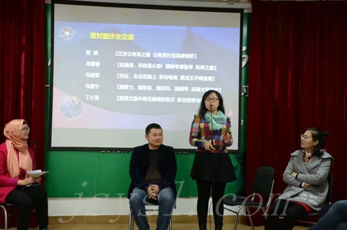 交流活动还就“丈量自身条件和目标,合理选择就业和择业”、“文博行业现状及前景,就业者素质要求”、“这条路拼的是心态——读研考博、留学科研之路”、“移动电商的创业之路——西瓜王子创业故事”“敬主爱人法则在职场的运用”、“越努力越幸运、越成功越谦卑——大学创业”等主题进行了多场分享。