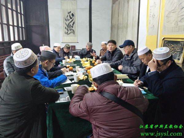 沙振镇会长向客人介绍了镇江市的概况和伊斯兰教在本地的传承历史。薛龙和副会长从文化认同角度介绍了镇江现存清真寺的建筑风格及其楹联匾额。双方还就“伊斯兰教中国化实践方法”、“新建清真寺中如何把伊斯兰教建筑特色与中国传统建筑元素有机融合”、“外来穆斯林服务”、“伊协、寺管会制度建设”、“人才培养”、“解经”等共同关心的问题进行了座谈交流。