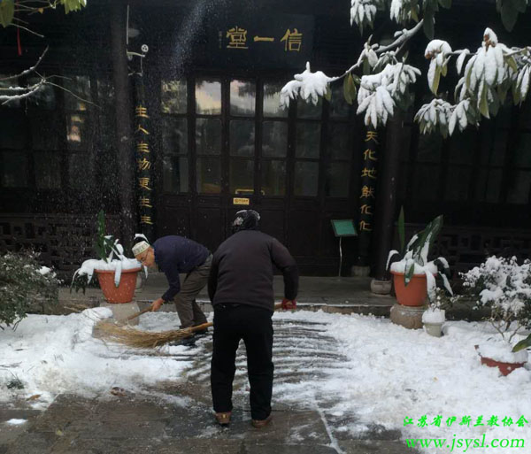 1月25日以来,连续两场罕见暴雪给人们生活带来诸多不便。面对极寒恶劣天气,镇江市伊协高度重视,在接到气象部门和省市民宗局相关通知后,立即召开市伊协、寺管会紧急会议,明确人员责任,采取应对措施,制定应急预案,以确保清真寺和所有入寺礼拜人员生命财产安全;要求各清真寺及时组织人员清扫寺内及周边巷道的积雪,做好“防滑、防摔、防砸、防撞、防塌”预防处置工作;要加强对各清真寺及周边巡视检查,防止因积雪而导致的各类次生灾害;要求伊协、寺管会主要负责人确保24小时通讯畅通,突发事件要及时科学处置,上报信息。